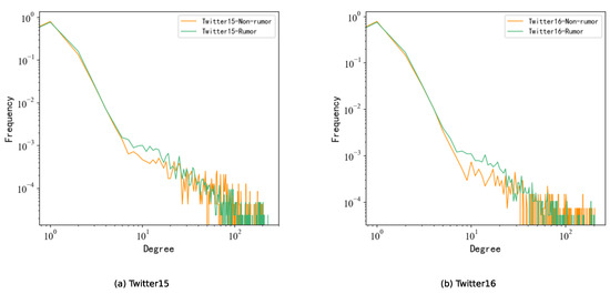 Further, we computed and compared the topological metrics of the information dissemination graphs, such as the number of nodes, number of edges, average path length, degree distribution, etc. We used the average values of the metrics for all graphs in both categories, non-spurious information and spurious information, as the final comparison data. The calculation results of the network structure metrics are detailed in Table 9; see Figure 6 for the visualization of the degree distribution.