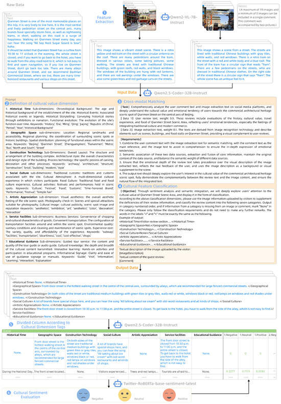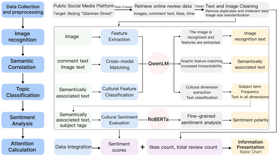 Figure 2). First, UGC was scraped for the target scenario and cleaned. Then, the QwenLM model was applied for image feature extraction, followed by cross-modal matching to semantically associate the user text with image features. This resulted in semantically enriched cross-modal information. Subsequently, QwenLM categorized and extracted the cultural theme dimensions, while the RoBERTa model conducted a fine-grained sentiment analysis, quantifying users’ emotional polarity and its distribution across cultural dimensions.