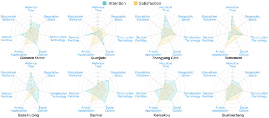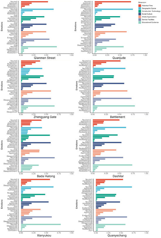 Despite a predominance of neutral and positive sentiments, certain landmarks and cultural dimensions exhibit more complex emotional layers. For instance, in the socio-cultural dimension, Qianmen Street and Dashilar demonstrate a strong “appreciation” sentiment, likely due to their rich historical significance and cultural identity.