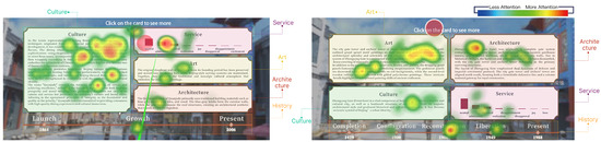 Figure 8, key patterns emerged. In the Zhengyangmen scene, users’ fixation points were primarily concentrated in the cultural and architectural modules, especially in text areas related to the historical background. This indicates that users were more inclined to focus on architectural history, cultural narratives, and their evolution over time.