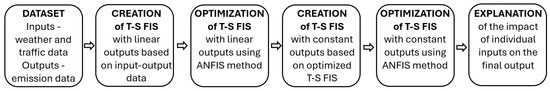 In the next step, the parameters of input and output variables need to be optimised (see Section 3). Several techniques have been developed for the parameter optimisation of Takagi–Sugeno FISs. For example, evolutionary algorithms (see [27]) or artificial neural networks (see [28]) can be used. We worked with an adaptive network-based fuzzy inference system (ANFIS), which is an optimisation method using artificial neural network principles (see [28]). The ANFIS consists of a neural network of five layers, where two of the layers are adaptive (one of them optimises the parameters of the input variables, and the other optimises the parameters of the output variables) and the rest of the layers are computational. As an input of the ANFIS, some Takagi–Sugeno FIS is given. Then, as a result, a new Takagi–Sugeno FIS with the same number of rules but with new variable parameters is obtained.