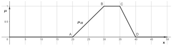 This type of membership function is called the trapezoidal membership function. Note that we can uniquely determine such functions by using four parameters . For the function displayed in Figure 2, these parameters are , i.e., the first coordinates of points A, B, C and D. Notation using four coordinates is also used in MATLAB software. As we can see, we chose these values as integers. Since the values of these parameters significantly affect the result, even a small change in the parameter values can lead to a significant improvement in the overall result. Various optimisation methods are used to find more accurate values. They are often incorporated into software for working with fuzzy sets.
