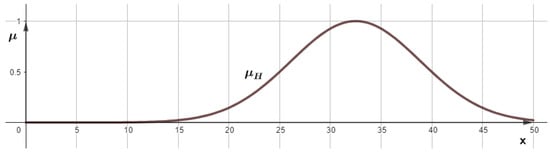 As an example, Figure 2 displays the membership function modelling the high temperature in summer problem mentioned above. From this figure, we can see that the considered domain for temperature in summer is a set . The temperatures from the interval surely belong to the set high temperature in summer (they were assigned a value of 1). The temperatures from the intervals and surely do not belong to the set high temperature in summer (they were assigned a value of 0). The temperature values from the interval [20, 30] were assigned a degree of membership to the set high temperature in summer by simply connecting the points and with a straight line. Similarly, the temperature values from the interval [35, 40] were assigned a degree of membership to the set high temperature in summer by simply connecting the points and with a straight line.