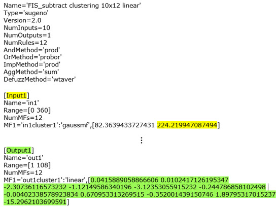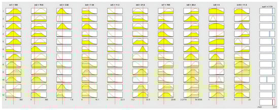 In Figure 5, the value of the position of the centre of the Gaussian function for the first input variable in the first rule is marked in yellow. Of course, we considered the values of the position of the centres of all the Gaussian functions that occurred in the first rule. We have ten values (let us label them ). On the other hand, to each rule, an output in the form of 11 values was assigned (they are marked in green in Figure 5). The first 10 values represent the linear terms (let us label them ), and the 11th value represents the absolute term (let us label it ) of the linear function. Then, the constant output for the first rule can be computed as
