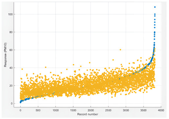 Emission data were used as the output variable. In this article, we demonstrate just the results for values. As mentioned before, for , the limit value of 50 g/m3 per day cannot be exceeded more than 35 times per calendar year. For our location, this variable reached values in the interval . Let us also state that from the 3845 measurements that we had, there were just 2 values greater than 100 g/m3, only 26 reached a value greater than 60 g/m3 and, similarly, there were just 75 values greater than 50 g/m3. Since this concerns the pollution of the urban area, the presence of a low number of high values is positive, but when processing and analysing data with all permissible values, this is a rather large deficiency.