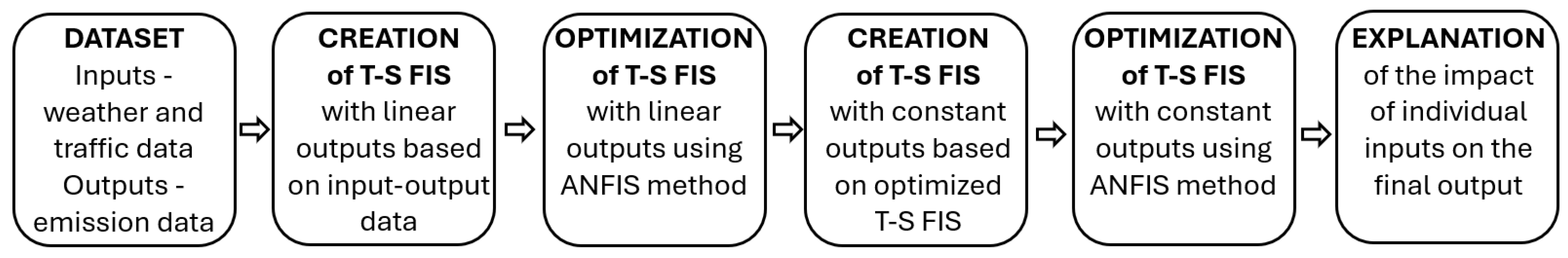 The input variables of the Takagi–Sugeno FIS are defined by using fuzzy sets as in the case of the Mamdani FIS. However, the output variables of this system are determined by using simple functions (linear or constant functions). The overall output of the system is determined by the function that represents the weighted arithmetic average of the individual output functions. The weights of the individual functions are determined by using the fuzzy set values for specific input values. Since this work focuses on the application of the Takagi–Sugeno FIS as an explanatory element in air quality prediction, we present the use of such a system in the next section in detail.