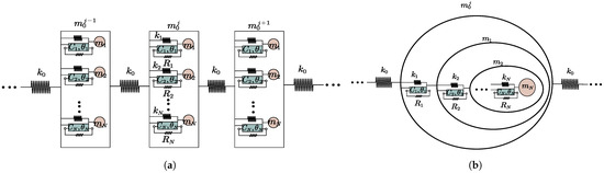 The schematic diagram in Figure 1 illustrates two types of hierarchical configurations, namely the outward and inward configurations. The outward configuration Figure 1a arranges the electromechanical resonators in parallel; however, the inward configuration Figure 1b arranges them in a nested manner such that the electromechanical resonator is connected to the and electromechanical resonators [25]. In this setup, a unit cell consists of N electromechanical local resonators with masses , arranged within an outer mass . Adjacent unit cells are linked by a spring with a stiffness constant, , creating a continuous metamaterial chain. The stiffness of the resonator connectors is denoted as , , ⋯, . A resistor-loaded shunt circuit is integrated into each piezoelectric patch. The parameters , , and are the electromechanical coupling coefficient, the capacitance of the piezoelectric materials, and the resistance of the shunt circuit, respectively. The maximum number of local resonators, N, is determined by the hierarchy order, which is defined as . In this work, in this work, the zero-order and first-order configurations, with and , respectively, will be studied.