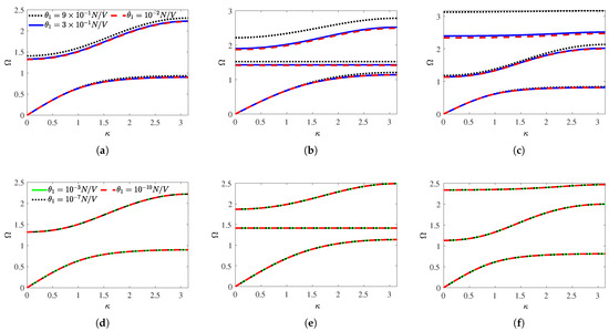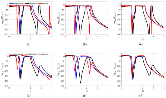 The effect of strong electromechanical coupling coefficients on the band structure of (a) zero-order, (b) outward, and (c) inward configurations. The effect of weak electromechanical coupling coefficients on the band structure of (d) zero-order, (e) outward, and (f) inward configurations at and .