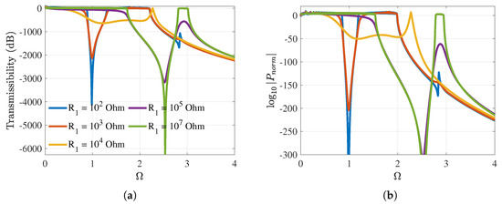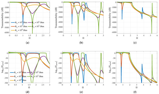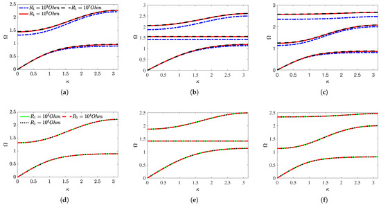Figure 3 shows the dispersion curves of hierarchical metamaterials for strongly and weakly coupled systems, evaluated at different resistance values of the shunt circuit. The resistances of the shunt circuit show a noticeable impact on the band structure of strongly coupled hierarchical metamaterials, as evidenced in Figure 3a–c. However, it exhibits minimal effect on the band structures for the weakly coupled system, as shown in Figure 3d–f. This highlights how the coupling strength dictates the sensitivity of the system’s band structure to changes made to the shunt circuit resistance values.