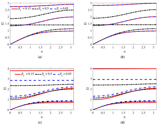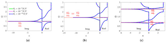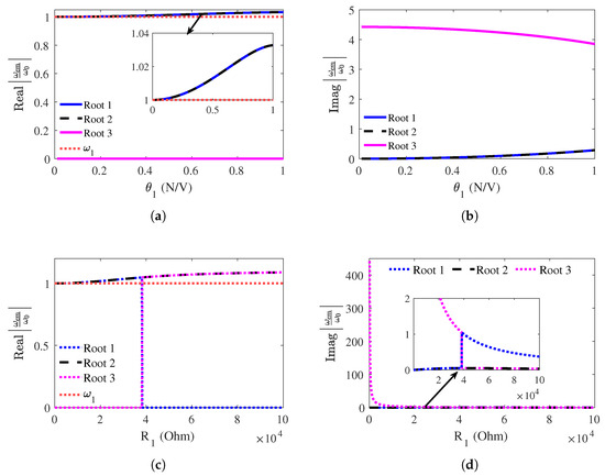 The roots of Equation (19) are shown graphically in Figure 4, providing a visual representation of their behavior under varying electromechanical coupling coefficients and the resistance of the shunt circuits for the zero-order hierarchy. The red dotted horizontal lines represents the undamped tuning frequency, , of the resonator. The real part of the electromechanical resonator tuning frequency increases with both the electromechanical coupling coefficient and the resistance of the shunt circuit. Relative to , it increases by as the coupling coefficient increases, as shown in Figure 4a, and by as increases, as shown in Figure 4c. At lower values of the electromechanical coupling coefficients and shunt circuit resistances, the real part of aligns with . The first two imaginary parts are equal and increase as the electromechanical coupling coefficient increases, while the third imaginary part decreases, as shown in Figure 4b. At low shunt circuit resistance, the imaginary component of the third root increases rapidly, which is important for strong vibration attenuation at the tuning frequency. Roots 1 and 3, as depicted in Figure 4c,d, swap positions without affecting the magnitude of the tuning frequency. The tuning frequency analysis of the electromechanical resonator reveals that the weakly coupled electromechanical resonator, shunted with a resistor-loaded circuit, adds only an imaginary component. However, strong electromechanical coupling increases the real part’s magnitude and introduces an imaginary part as the coupling coefficient and shunt resistance increase. The imaginary part contributes to the increase in peak attenuation, while the real part shifts the tuning frequency upward and widens the band gap.