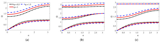 is assumed to establish the frequency-wavenumber relations for the infinite lattice [53,54]. In this solution, t is time, is excitation frequency of the system, and is the normalized wavenumber. Substituting the presumed solution into Equations (1)–(7) provides simultaneous equations for each configurations. By substituting the assumed solution form into Equations (1)–(3), we obtain the following results: