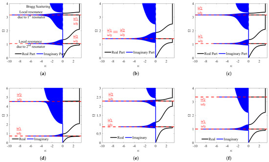 Real and imaginary wavenumber components of weakly coupled systems. (a) outward at , (b) outward , (c) outward at , (d) inward , (e) inward , (f) inward .