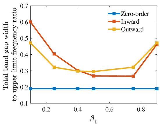 In the zero-order hierarchy, the total band gap width ratio is defined as the ratio of the band gap width to the upper limit frequency of the second passband. This ratio remains constant regardless of the variation of . In the first-order hierarchy, the total band gap width ratio is the ratio of the total band gap width to the upper limit frequency of the third passband. The inward configuration’s total band gap width ratio is lower than the outward configuration’s total band gap width ratio when is greater than 0.4. For , the total band gap width ratio of the inward configuration exceeds the outward configuration’s total band gap width ratio. The inward configuration enhances the zero-order configuration’s band structure by a minimum of , while the outward configuration achieves at least enhancement, as illustrated in Figure 10. Moreover, the total band gap width ratios of the first-order configurations are larger than the zero-order hierarchy. This implies that, relative to the zero-order hierarchy, the first-order hierarchy produces a larger total band gap width and increased bandwidth.