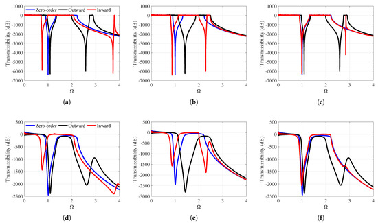 For the inward configuration, the first attenuation region shifts to the left when is less than , indicating its ability to attenuate vibrations at lower frequencies. The zero-order and first-order hierarchies show equivalent sizes of the first attenuation regions when is greater than . The first-order hierarchy produces a first attenuation zone of similar size to the zero-order hierarchy at certain such as = 0.85. This is one of the benefits of the first-order hierarchy, as it retains the same effective frequency attenuation, while also introducing the potential for additional attenuation through the second attenuation region. The second local resonance vibration attenuation zone in the first-order configurations is located within the Bragg scattering attenuation zone of the zero-order hierarchy. Local resonance attenuation is stronger than Bragg attenuation, which is crucial for effective vibration attenuation. The local resonance attenuation regions can be tuned through to target specific frequencies and broaden the band of attenuated frequencies compared to the fixed band gap of the zero-order hierarchy. The first-order hierarchy transmits the high-frequency third passband, which is not possible in the zero-order hierarchy, with a narrower bandwidth in the inward configuration compared to the outward configuration. In addition to the effect of , the outer mass displacement transmissibility of strongly coupled hierarchical metamaterials is affected by electromechanical parameters. Strongly coupled hierarchical metamaterials effectively suppress higher frequency resonance peaks, as demonstrated in Figure 11d–f. The strongly coupled system significantly reduces the local resonance peaks of the third passband in first-order configurations. However, the second passband exhibits higher transmissibility, and the first local resonance band gap shows weaker attenuation in the strongly coupled inward configuration. The decrease in peak displacement transmissibility with increasing frequency in strongly coupled electromechanical systems indicates that strong electromechanical coupling is more effective at damping higher frequency vibrations. The outward configuration shows relatively minimal peaks and deep valleys.