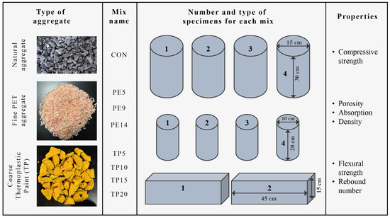 Eight mixtures were prepared in total: one conventional (CON); three that replaced the fine aggregate with PET sand in percentages of 5% (PE5), 9% (PE9), and 14% (PE14), keeping the natural coarse aggregates constant; and four that replaced the natural coarse aggregate with thermoplastic paint (TP) gravel in percentages of 5% (TP5), 10% (TP10), 15% (TP15), and 20% (TP20), keeping the natural fine aggregates constant.