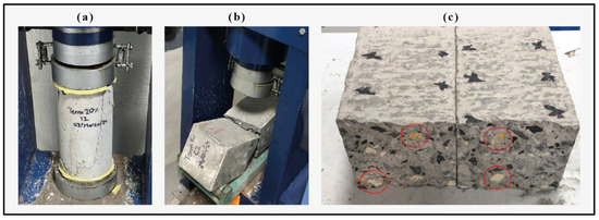 (a) Compression test, (b) flexural test, and (c) fractured beam with exposed TP aggregates.