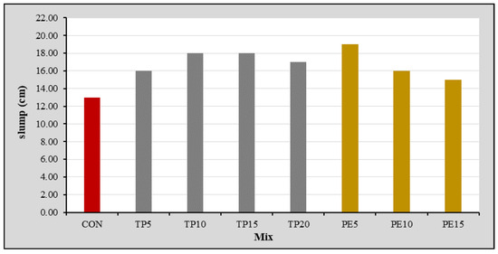 The results of the physical and mechanical tests allowed for establishing potential applications for recycled plastic concrete and to visualize future scenarios for plastic aggregates. The slump test results of the mixtures (Figure 5) ranged between 15 and 19 cm which is appropriate for the size of the specimens produced; this is consistent with previously reported studies [12,15]. However, regarding this property, there are still discrepancies in terms of the influence that RPA has on new concrete. Askar et al. (2023) [7] reviewed different works, and some of them reported gains in slump, while others reported losses [11,20], although some of these losses were not significant.