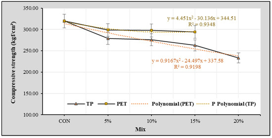 Contrary to the above results, some studies have found that the properties of the reference mixture can be slightly improved. Chan et al. (2022) found that the compressive strength increased when 5% PET gravel was used [18]; meanwhile, by using 10% PET aggregate, Babafemi et al. (2022) found gains of 3% [13], and Kangavar et al. (2022) found gains of 9% [37].