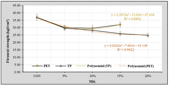 The results of previous studies and this one demonstrate an opportunity for using sand in non-structural and structural concrete and establish the foundation for exploring the advantages of plastic aggregates in sustainable concrete. Regarding the flexural resistance (Figure 7), it was found that with a replacement of up to 10% PET sand, the resistance decreased by about20%. In comparison, when the replacement was increased to 15%, the resistance increased, with a loss of 13%. Given these fluctuating losses and gains in flexural strength, it is recommended to increase the percentages of PET sand substitution to analyze an adequate trend and infer whether higher percentages lead to gains in this property. This could be attributed to a potential increase in the deformability, which the more ductile nature of PET could provide.