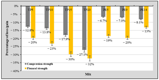 On the other hand, higher compressive strength was reported in the mixtures where FRPA was used compared to the mixtures with CRPA (Figure 6). In addition, it was observed that, as the percentage of RPA substitution increased, both for PET sands and TP gravels, the compressive strength decreased when compared to the conventional mixture. The PE5 (−6.7%), PE9 (−7%), and PE14 (−8%) mixtures presented maximum losses of 8% compared to the conventional mixture.