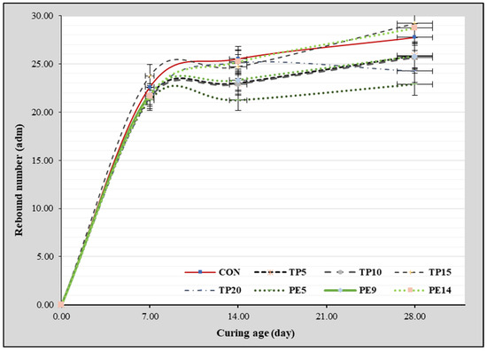 The slumps of the eight mixtures reached 17 cm, with a standard deviation of 1.76, which is 23.5% higher than the conventional mixture (13 cm). In the mixtures with TP, it was possible to control the water, resulting in similar slumps between them (16–18 cm). The PE mixtures showed a tendency for the slump to decrease as the replacement percentage increased, ranging from 19 cm (PE5) to 15 cm (PE14). However, it did not reach the value of the conventional mixture (13 cm). This is due to the poor adhesion between the cementitious matrix and the RPA [12,22], in this case, PET sand and TP gravel, which caused a reduction in the rigidity of the matrix linked to the settlement gain [12]. In addition, the RPA and the cementitious matrix present a chemical incompatibility that lead to losses in the mechanical properties, such as the compressive strength, tension, and modulus of elasticity, since the smooth surface of the plastic, its impermeability, lower resistance, and hydrophobic nature weaken the cohesion forces at the interface between the cementitious matrix and the aggregates [17,65,66], causing a weak adhesion [67].