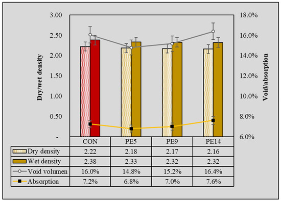 Regarding the dry and wet densities of the PET specimens (Figure 10), a loss of less than 3% was observed for all mixtures; previous studies have reported decreases in density when RPAs were used [13,15]. The results showing slight losses in density are consistent with the results of the compressive and flexural strength (Figure 10), which show that the incorporation of RPAs did not lead to significant changes in the basic physical and mechanical properties of the concrete. In fact, an even better arrangement of particles is expected, due to a slight decrease in porosity in the PE5 and PE9 mixtures.