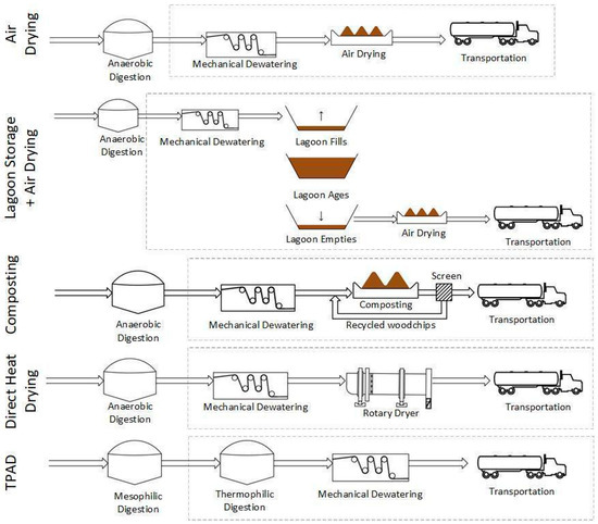 Based on the NEBRA study [2], the most common biosolids treatment process that falls in the LCLT category is long-term storage (also known as Lagoon Storage). Lagoon Storage holds biosolids for one or more years and allows the organic matter to decompose under a combination of aerobic and anaerobic conditions. This study specifically focused on a high solids sludge processing train (HSSPT) Lagoon Storage, where mechanical dewatering of biosolids occurs before being placed in the lagoons. In this study, we examined long-term Lagoon Storage coupled with Air Drying (hereafter referred to simply as Lagoon Storage) because this treatment process has been successfully utilized for many years by the Metropolitan Water Reclamation District of Greater Chicago at their Calumet and Stickney WRRFs [12]. After removing biosolids from the lagoons, the biosolids are placed on Air-Drying pads for ten weeks. In that time, the percentage of total solids reaches 60% [8]. Air Drying is an LCLT process in which biosolids are placed on impervious or porous sand surfaces in windrows or spread in layers and dried to 50–70% total solids [8]. It was included as a standalone Class A biosolids treatment process for evaluation in this study because it is being implemented at a number of WRRFs, and therefore, there are available data on full-scale Air-Drying operations. In Air Drying, the evaporation of water and the degradation of organic solids occurs when mixing creates an aerobic environment. In this study, it was assumed that biosolids are dried in windrows on an impervious surface.