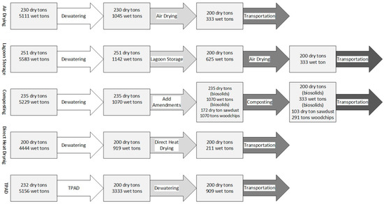 Importantly, each process assumes a slightly different mass flow of material through the process to generate the common functional unit of 200 dry tons of Class A biosolids produced per year (Figure 2). Varying amounts of material are needed to produce the same amount of biosolids because of the differences in volatile solids destruction achieved by the various treatment trains and the addition of a carbon source and bulking agent amendments in the Composting process (Figure 2).