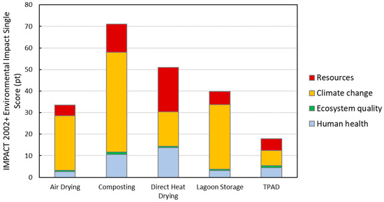 The environmental impacts presented for each process are the sum of the four damage categories used within IMPACT 2002+: resources (non-renewable energy and extracted minerals), climate change, ecosystem quality, and human health, expressed as dimensionless unit points (pt.). Of these categories (Figure 3), climate change was the largest contributor to the overall combined environmental impact score for each of the processes, except Direct Heat Drying, for which resource use (primarily natural gas) was the biggest contributor to the overall environmental impact. On the other extreme, the ecosystem quality damage category contributed minimally to the overall environmental impact of all processes. Comparing the environmental impacts results between processes (Figure 3), Composting had the greatest environmental impacts at 71.1 pt., followed by Direct Heat Drying and Lagoon Storage at 50.9 pt. and 39.8 pt., respectively. TPAD had the lowest overall environmental impact score of all of the processes (18.0 pt.), followed by Air Drying (33.5 pt.). Detailed analyses of these scores are provided below.