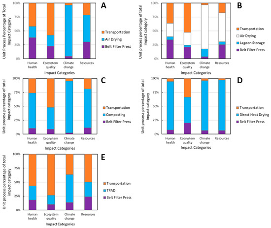 Contributions of individual unit operations to the overall environmental impacts of (A) Air Drying; (B) Lagoon Storage; (C) Composting; (D) Direct Heat Drying; and (E) TPAD.