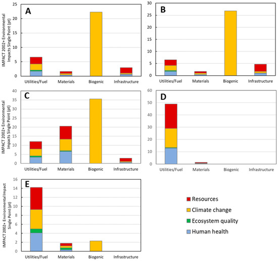 Utilities/fuel, materials, biogenic, and infrastructure sources of environmental impacts of (A) Air Drying; (B) Lagoon Storage; (C) Composting; (D) Direct Heat Drying; and (E) TPAD. Note that the vertical axes in the panels are scaled differently but all have the same units of pt.