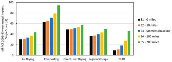 Round-trip transportation (100 miles total) to the biosolids land application site was also included as an input within the system boundary for all processes under study to evaluate the effects of the moisture content of the end product and the addition of amendments on transport requirements and ultimate environmental impacts. In fact, the distances that WRRFs must transport biosolids varies widely. For example, the Portage Lake Water & Sewage Authority WRRF in Houghton, Michigan, transports biosolids to a maximum of approximately 10 miles one way to a land application site. In comparison, utilities in California generally transport biosolids hundreds of miles to Arizona, Nevada, and Oregon [19] to be applied to land, become landfilled, or become composted. To examine the impact of these variations in transportation distances on the LCA results, a sensitivity analysis was conducted using 0, 20, 100, 200, and 400 miles as round-trip transport distances.