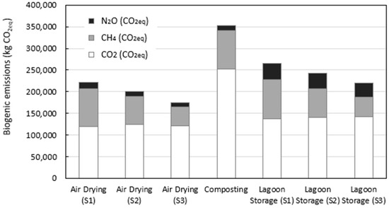 Biogenic emissions for biosolids treated via Air Drying, Lagoon Storage Plus Air Drying, and Composting. S1, S2, and S3 refer to the Air Drying sensitivity analysis scenarios (see Table 2).