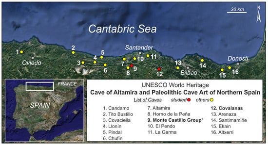 Location and list of caves included in Cave of Altamira and Palaeolithic Cave Art of Northern Spain UNESCO World Heritage. * The Monte Castillo Group includes El Castillo, La Pasiega, Las Monedas, and Las Chimeneas caves.
