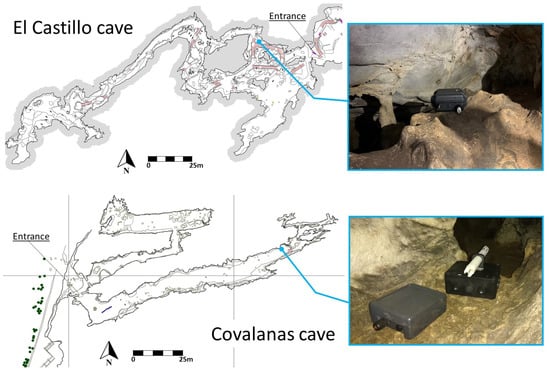 This study presents a characterisation of the environmental dynamics of two of the main tourist caves with parietal art in Cantabria—El Castillo and Covalanas—both included in the UNESCO Word Heritage site Cave of Altamira and Palaeolithic Cave Art of Northern Spain (Figure 1) but with a very different pattern of visitation on an annual and daily basis. Based on the records obtained during three annual cycles, the evolution of the temperature and gaseous composition of the underground air in each cave was studied in relation to seasonal changes in the local meteorology, as well as the interannual evolution of anthropogenic impacts on the underground microclimate under different regimes of daily visits. The objective of this study is to determine the carrying capacity of the two caves. This aims to prevent changes in key environmental parameters (air temperature and CO2 concentration) that exceed their natural daily and/or seasonal variations, thus avoiding cumulative effects that could lead to the irreversible progression of corrosion and biodeterioration.
