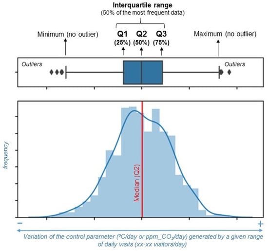For each range of daily visits, the following statistics have been calculated for the variations generated in each control parameter (temperature and CO2 concentration): median and first and third quartiles, as well as the maximum and minimum non-atypical values (variance) of each parameter (Figure 3). In this way, the daily impacts on the microclimate can be characterised for different increasing ranges of visits, and this information is synthesised graphically by means of box-and-whisker plots. The box-and-whisker method is based on the variance decomposition that can assess the contribution of input factors to the variance of outputs []. Each box plot shows the statistics used, including the median, third quartile, and first quartile, i.e., 50%, 75%, and 25% of the distribution of values for each parameter for a given range of daily visits to the cave (number of visitors each day).