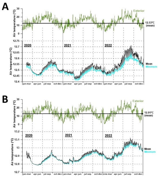 Time series of outdoor and indoor air temperatures (mean and minimum values) in the El Castillo cave (A) and Covalanas cave (B) during the triennium 2020–2022.