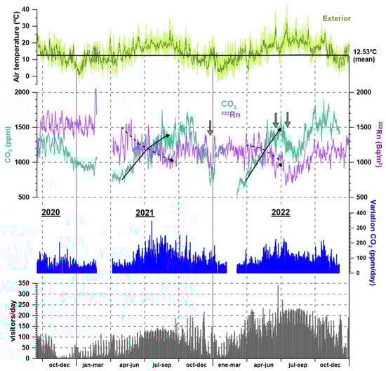 Time series of tracer gas concentration (CO2 and 222Rn) in the El Castillo cave during the period of October 2020–December 2022. The black arrows, continuous and dashed, highlight the opposite trend in the concentration of both gases, indicative of a ventilation process (222Rn) masked, in the case of CO2, by the cumulative effect of the impacts generated by the increasing rate of daily visits. Vertical grey arrows indicate ventilation pulses due to the entry of warmer external air from lower levels.