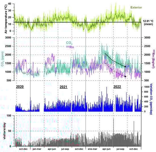Monitoring the composition of underground air in gases such as carbon dioxide (CO2) or radon (222Rn) is key to characterise the process of the renewal or mixing of air with the external atmosphere and, therefore, monitoring these tracer gases allows us to evaluate over time the degree of isolation and environmental stability of a cavity. Controlling CO2 concentration is also essential in the study of speleogenetic processes, and its detailed monitoring allows us to evaluate the degree of environmental destabilisation generated by visits which, together with thermal disturbances, can activate the deterioration processes of the rock supporting the cave paintings. In particular, the CO2 emitted by visitors’ respiration can dissolve in the infiltration or condensation water that is in contact with the supporting rock, triggering corrosion processes [,,,,,,].