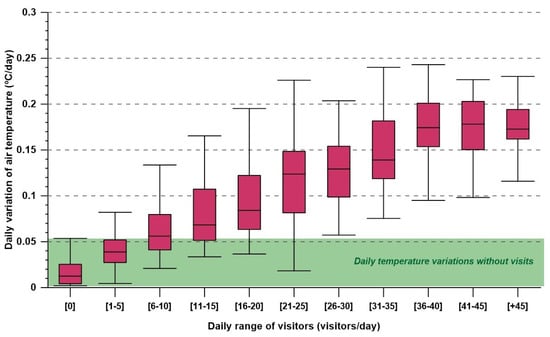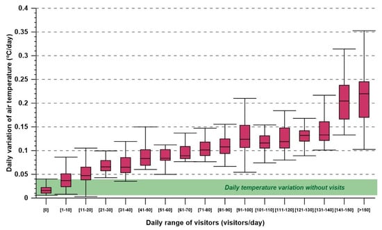 The variations in air temperature in the El Castillo cave generated by the daily influx of visitors are shown in Figure 7. The maximum daily thermal amplitude during periods without visitors was 0.03 °C, with an interquartile variation range of only 0.01 °C. This high thermal stability under natural conditions was altered with the continued entry of a small number of visitors per day, showing a clear increasing trend in daily thermal variation as the ranges of daily visitors increase. Rapid thermal destabilisation, generated even in reduced ranges of visits (10–20 visitors/day), may be caused by the cave lighting system, which remains on during all opening hours to the public. The calorific effect of lighting causes the air temperature to exceed the maximum ranges of thermal variation in natural conditions, increasing the thermal impacts synergistically as the daily number of visitors increases.