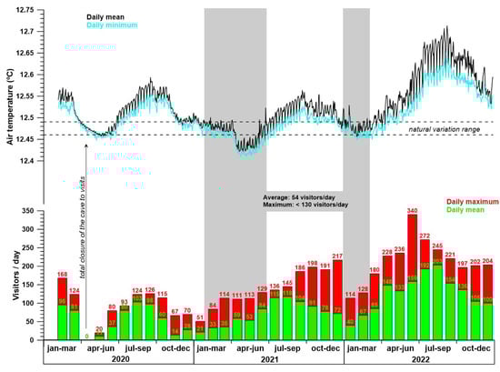 Evolution of the mean and minimum daily air temperature in the El Castillo cave in relation to the monthly visitor data (daily mean and maximum). The dashed lines indicate the air temperature thresholds of the cave under natural conditions (without visits). The grey shaded area indicates the daily rate of visits that ensure that daily variations in temperature are within the thresholds of cave air temperature under natural conditions.