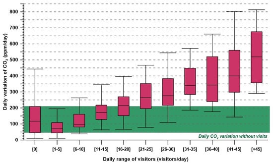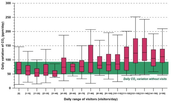The variations in the CO2 concentration of the air in the El Castillo cave generated by the daily influx of visitors are shown in Figure 9. Under natural conditions, without visitors, the daily variation in CO2 concentration was within a wide range, between 10 and 145 ppm, with an interquartile range between 50 and 90 ppm that included 50% of the most frequent daily variations in this parameter. Therefore, the reference threshold under natural conditions is 90 ppm/day, that is, the one corresponding to the third quartile of daily variations in CO2 in the unvisited regime. This threshold of daily variation in CO2 was continuously exceeded when the ratio of visitors to the cave is greater than 60 visitors/day, reaching a maximum variation of 180 ppm (Q3) when visits reached a range of 120 to 140 visitors/day.