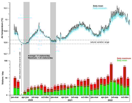 During the 72-day period of continuous closure for visitors (14 March to 25 May 2020), the temperature varied only by ±0.03 °C around 12.80 °C and did not present any notable daily cycles (Figure 10). This reference pattern of thermal stability under natural conditions continued in the initial stages of the reopening of the cave to tourism (June 2020) and returned seasonally during the two-month period of January–February 2021, with daily amplitudes due to the influx of visitors that did not exceed 0.10 °C/day. The number of visitors during these periods was limited, with a monthly average of 11 visitors/day and monthly maximums always below 25 visitors/day. In contrast, in the same winter period of the following year (January–March 2022), the air temperature, despite following a decreasing trend, did not reach these reference levels of stability (Figure 11). The cumulative effect on air temperature during 2022 was quite intense and demonstrated the fragility of the cave in the face of such a large-scale visitation regime.