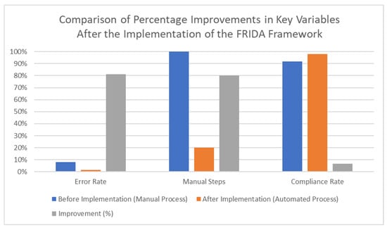 The bar chart, Figure 2, illustrates the significant improvements in key variables following the implementation of the FRIDA. It compares the performance of the manual process before implementation with the automated process afterward. The data reveal an impressive 81.25% reduction in the error rate, dropping from 8% in the manual process to 1.50% after automation. Furthermore, the automation resulted in a drastic 80% decrease in manual steps, reducing the reliance on human intervention from 100% to 20%. Although the improvement in the compliance rate was more modest, it still showed a notable 6.5% increase, rising from 92% to 98%. These results highlight the substantial efficiency gains and enhanced accuracy achieved through the automation process.