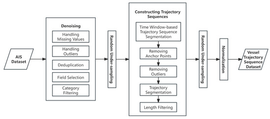 Data quality plays a crucial role in classification algorithms based on neural network models, and the process of collecting ship trajectory data can introduce noisy data. Therefore, it is necessary to perform data preprocessing. Taking the AIS dataset as an example, the data preprocessing workflow is illustrated in Figure 1.