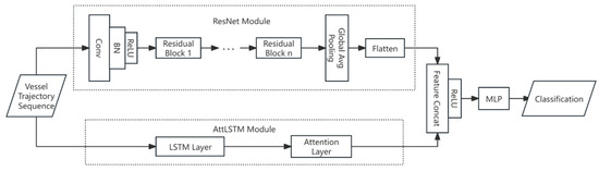 As shown in Figure 2, the ResNet1D-AttLSTM ship trajectory classification model primarily comprises a feature extraction module based on ResNet1D and AttLSTM, as well as a classification module based on a multilayer perceptron (MLP).