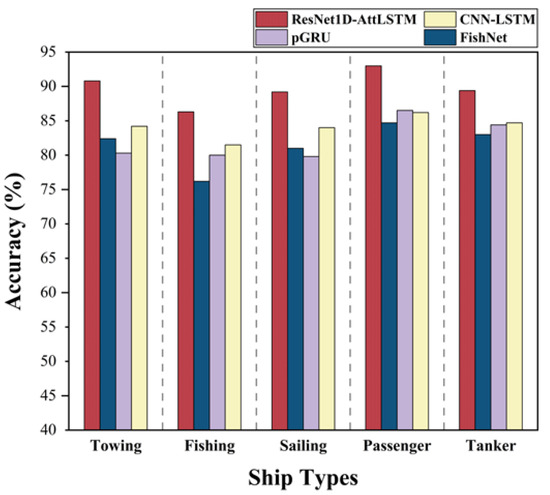 To further evaluate the performance of the ResNet1D-AttLSTM model, this study conducted comparative experiments, comparing it with trajectory classification models based on FishNet [31], pGRU [32], and CNN-LSTM [34] network architectures. The selection of these models was based on their methodological relevance to our work, as they employ deep learning architectures for ship trajectory classification, to process trajectory data as a sequence task without converting it to an image, and to address similar maritime application scenarios. Among these, FishNet employs a one-dimensional convolutional neural network architecture, while pGRU represents an advanced recurrent neural network variant that achieves efficient modeling of low-dimensional heterogeneous data by partitioning each input feature within the activation function and assigning independent parameters to each partition. The comparative experiments used accuracy as the evaluation metric, and the results are presented in Table 5 and Figure 7.