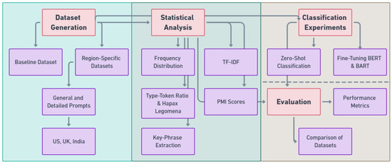 - Statistical Analysis: A range of statistical analyses are conducted to evaluate the linguistic diversity and regional differences in the generated datasets. These analyses include frequency distribution, TF-IDF, type–token ratio, hapax legomena, PMI scores, and key-phrase extraction.
