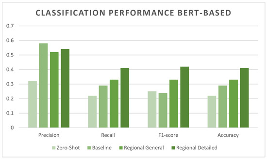 In the context of zero-shot classification, the pre-trained models exhibited significantly different performance levels. As shown in Figure 2 and Figure 3, the pre-trained BERT model performs poorly without additional training. In contrast, the selected version of the BART model, pre-trained for natural language inference, demonstrates inherent zero-shot capabilities, which are evident in its performance.
