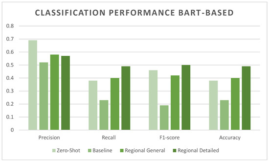 The BART model fine-tuned with the regionally detailed datasets consistently outperforms other configurations, achieving the highest accuracy and F-1 score across all experiments. This suggests that the pre-trained BART-large-MNLI model, which has been specifically optimized for natural language inference, benefits significantly from fine-tuning on domain-specific data, further enhancing its capability to handle nuanced classification tasks.